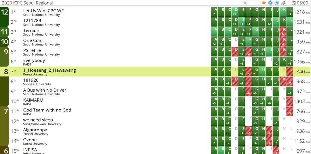 이번 리저널의 목표는 사실 Semi-World Final이 코로나로 인해 없어진 상황에서 수상권 안에만 드는 것이 목표였습니다. 예선에서 거의 20등에 가까운 성적을 받기도 했고, 서울대 6팀과 카이스트 2팀 내외, 그리고 정말 몇 달을 밤잠을 못 자게 만들었던 숭실대 팀 181920을 이기는 것이 사실상 힘들다고 예상했습니다. 심지어는 고려대의 I hate PS 팀을 이길지도 확실하지 않아 학내 1등도 보장할 수 없었습니다. 무엇보다 181920이 너무 무서웠습니다. 에렌-으드누-주떼 라인업은 객관적으로 레이팅으로 봤을 때나 예선 성적으로 봤을 때나 포텐셜이 엄청난 팀입니다. 이 팀을 이겨야 대학순위 3위로 World Final에 진출할 가능성이 조금이라도 생기기 때문에, 정말 피말리는 경쟁이 되었습니다.